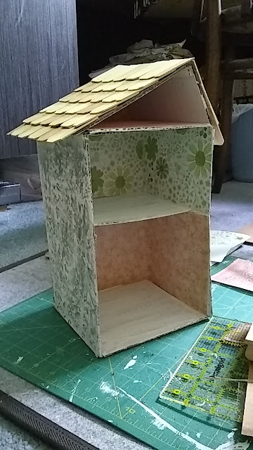 There is always an incredible mess when I start playing with cardboard and glue and paper and paint. This is laid out on the floor, and you can see the basic doll house shape already done. I painted the entire thing with gesso, then used scrapbook papers to paper the inside walls, and sponge painted a fern green to the outside walls. The floors are carpeted with felt, and the roof is shingled with old dollhouse shingles I've had for decades.